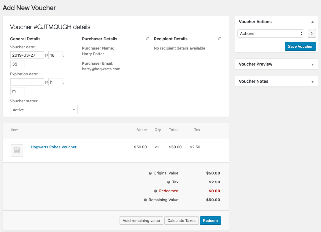 To view or edit a voucher, go to WooCommerce > Vouchers and select the voucher from the list. You can edit most voucher details from the Edit Voucher page, which is similar to the Edit Order interface.