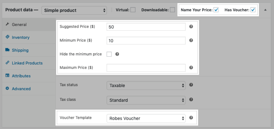 By default, vouchers use the price you’ve set for the product or its variations as the voucher’s value. To let customers enter their own voucher values instead, you can use PDF Product Vouchers with Name Your Price by checking the Has Voucher and Name Your Price boxes.